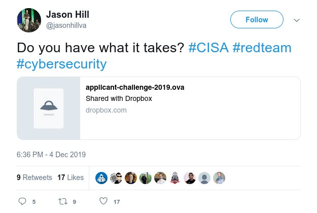 One of the clubs at my school is a cybersecurity club called UWB Grayhats. In the Discord chat for this group, a user posted a link to a Twitter post which contained an OVA file download with little additional information. (Although, with the hashtags #CISA and #redteam along with the user's profile reading Chief CISA (DHS) Cyber Assessments / Nations's Red Team, I did think it likely that this was a job application.)