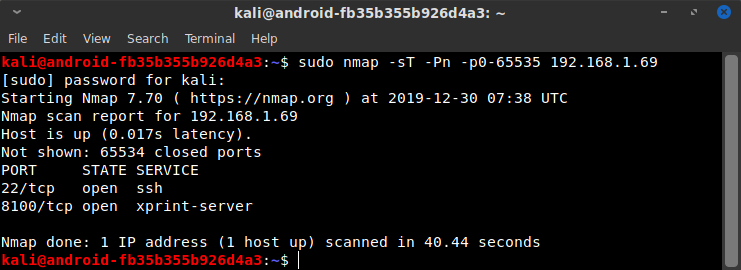 Only TCP ports 22 and 8100 were open, so I ran a new scan to do a more thorough examination of those open ports. Given the scope of the engagement, I wasn't worried about tripping any alarms, so I used the more aggressive scanning options. I also started a UDP scan in the background since UDP scans take significantly longer. (It finished some time later and did not yield any open ports.)