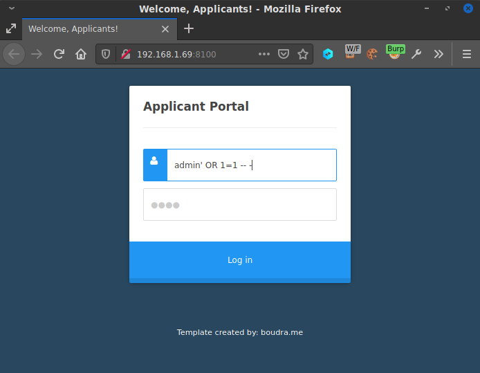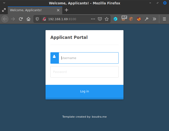 The website didn't yield a ton of very useful information. It simply displayed a basic login form with no extra fluff. I ran OWASP Dirbuster on the site, checking for directories and files with common web extensions. While that was running, I took a look at the source of the pages and enumerated what was available in those. The top-level index page loaded the relative stylesheet URLs /css/font-awesome.min.css and /css/styles.css as well as the javascript /js/jquery.min.js and /js/login.js. Although it was unlikely that there were exploitable files in those directories, they're still useful in learning about the structure of the website. I made a note of the file locations, and while Dirbuster was still running, I started googling for the “Template created by: boudra.me” text at the bottom of the page. It's likely that this is a standard free CSS template, but there's also a non-zero chance that boudra.me is a private entity, and in a real engagement, they might be a resource to contact for information about the target. But alas, after a few minutes of searching, it turned out the CSS theme was indeed just a standard free template.