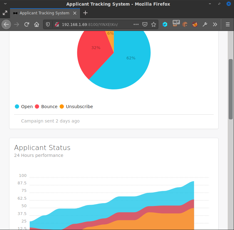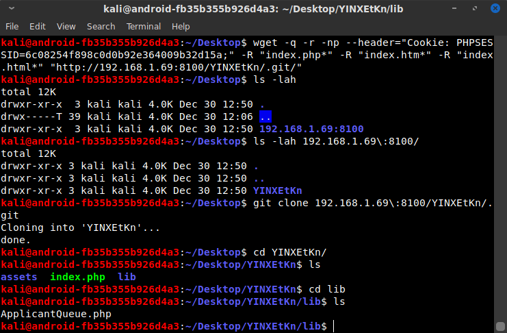 However, upon closer inspection of the javascript sources, it turned out to be just a smoke-screen. The displayed charts were not interactive nor updated by the javascript, and the account settings link did nothing. The only functioning part of the webpage according to the source code and associated javascript were the Add Applicant and Applicant Queue sections of the page. The associated javascript file located at /YINXEtKn/assets/js/applicant-api.js showed these sections to be updated via a POST request to /YINXEtKn/lib/ApplicantQueue.php. Seeing these paths made me realize that I hadn't run Dirbuster on this new location now that I was logged in, so I set it running again to search for anything it could find under the /YINXEtKn/ directory, using the same wordlist as before.