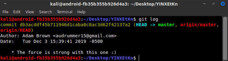 I immediately ran the git log command to see if there were previous versions of the history. There was only one initial commit, but it had a promising commit message: