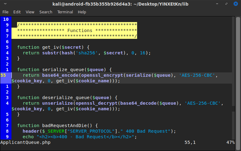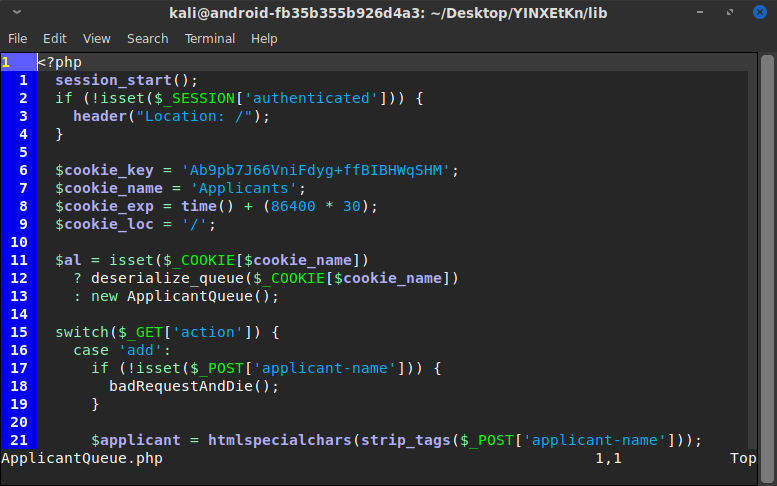 The serialization and deserialization really jumped out at me, especially because the serialized data was the text being sent back and forth in the cookie. Having used Python's pickle library and Java's dynamic class loading for some of my school courses, I was well familiar with the potential perils of run-time object loading. So I spent some time learning about PHP's version of using malicious serialized objects, which is referred to as PHP Object Injection. I learned a lot about how PHP Object Injection works and found several exploitable libraries and Github code examples. Unfortunately, there were none which seemed applicable to this situation. Because ApplicantQueue.php used no libraries or external code, I needed something in the default PHP library, or else in the ApplicantQueue.php code itself. More googling told me that PHP default functions weren't likely to be useful — which I suppose is a good thing... So I went back to the ApplicantQueue.php source code, and I took a closer look at the control flow of the code and the contents of the ApplicantQueue class.