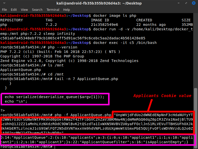 I created my own Docker container with PHP 7.2.2 in it, and copied the ApplicantQueue.php file into it. I modified it to disable the cookie checks and the data processing and to echo back just the decrypted version of the Applicants cookie strings I had saved, so I could see what they were. They ended up being ASCII-serialized versions of the ApplicantQueue class inside the PHP file, which confirmed my suspicion that there was no data being saved server-side and that the website's applicant queue was simply being processed and sent back.