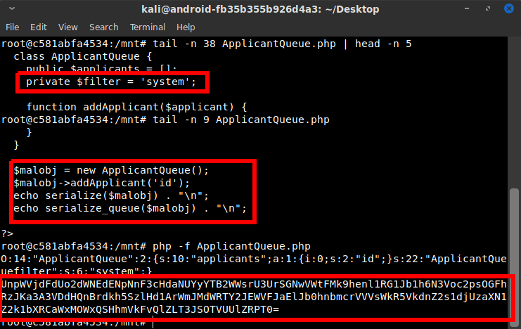 With my direction clear, I edited my testing version of ApplicantQueue.php and modified its class definition to set the $filter variable to "system" to call the PHP built-in system() function. I couldn't change the getApplicants() function, because the server-side deserialization wouldn't reflect those changes. However the $filter value was able to be controlled by me, and that's just as good since it is used directly in the called function.