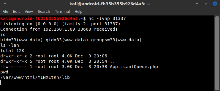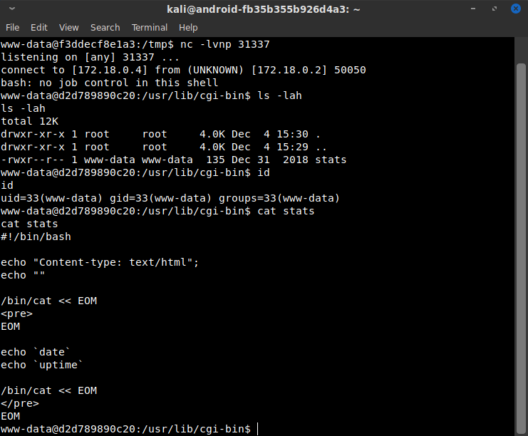 I got a second shell in the Docker container (by running a reverse shell command with an ampersand to background it) and started a netcat instance listening on port 31337 inside the current container. I did it inside the container in case the c2-web.local container was firewalled from connecting to the outside. Because of the curl run, I knew for sure it could talk to the container I was in, so I wanted to be safe and save myself from a potential hours-long headache diagnosing the wrong problem in the event my exploit didn't connect.