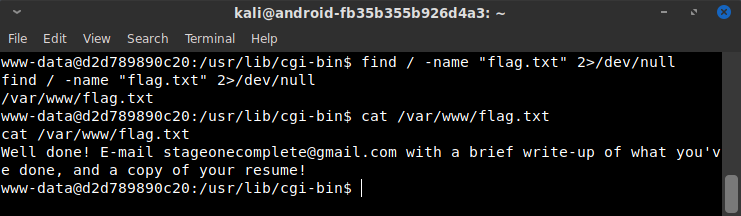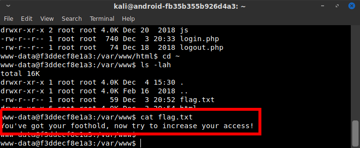 Browsing around the html folders, I immediately came across "flag.txt" sitting in /var/www/, which told me the challenge wasn't yet over: