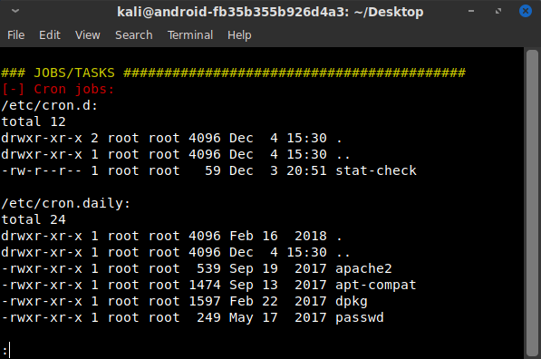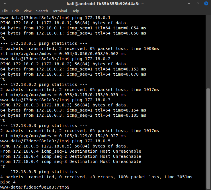I navigated to the /tmp folder, and downloaded a standard enumeration shell script called LinEnum.sh. This showed my network address as 172.18.0.4/16, which likely meant there were several other containers, and the host IP could probably be reached at 172.18.0.1. I didn't have ifconfig, nmap or any other utilities, so I ran ping on 172.18.0.1-172.18.0.3 and got responses, but 172.18.0.5 and onward showed nothing.