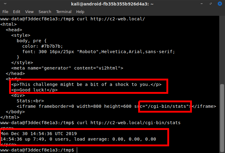 I ran the curl command to see what it showed, and the result was a simple webpage that loaded an iframe from the source /cgi-bin/stats. It also contained the text “This challenge might be a bit of a shock to you.” The cgi-bin path and the use of the word “shock” immediately made me suspect the path might be susceptible to the Shellshock exploit. Running curl on http://c2-web.local/cgi-bin/stats showed a page with outputs that immediately jumped out at me as likely being the results of system commands, which further solidified my assuredness that this was a Shellshock exploit.